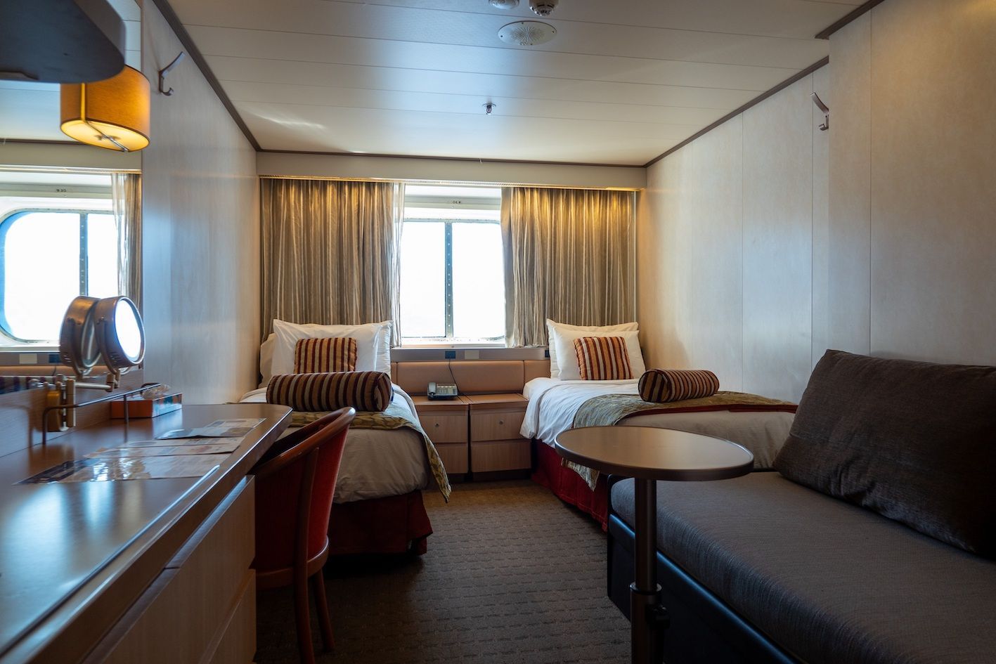 I stayed in an outside cabin to start the cruise which was reasonably sized and had a shower. However, I had to step into the bath to use it and this could cause some one with knee problems difficulties so I would suggest you enquire about a walk-in shower if you need one before you go.