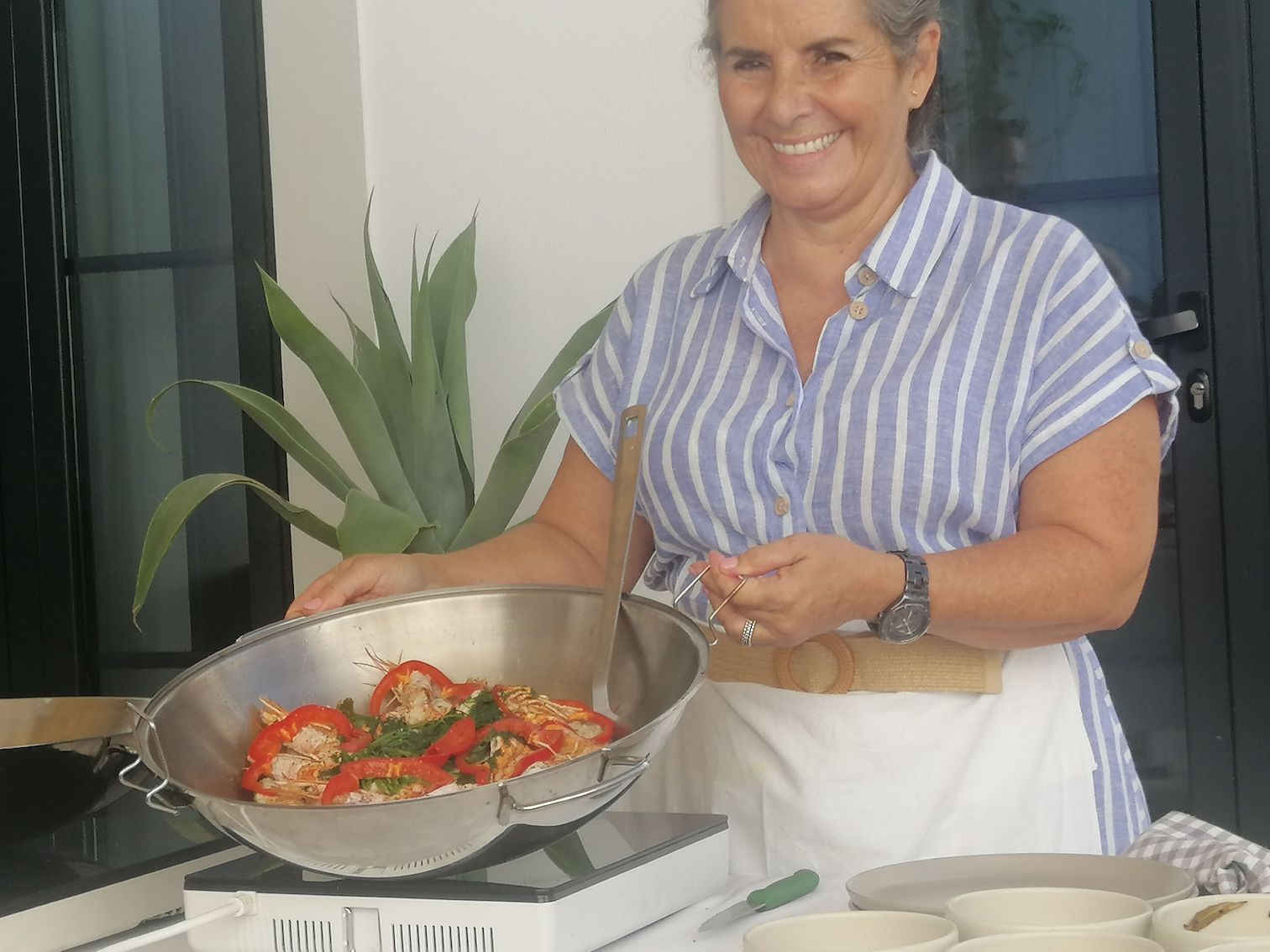 We accompany culinary expert Paola to the market to buy fresh produce for her cookery demonstration at the hotel. For our lunch, The six delicious courses include bruschetta; seared chorizo on pieces of sourdough bread; scrambled eggs and leeks; fig jam and anchovies on toast; sea bream with garlic paprika and red pepper sauce, prawn and onions and finally braised pears flavoured with cinnamon, cardamom, cloves, mustard seeds and lemon verbena.