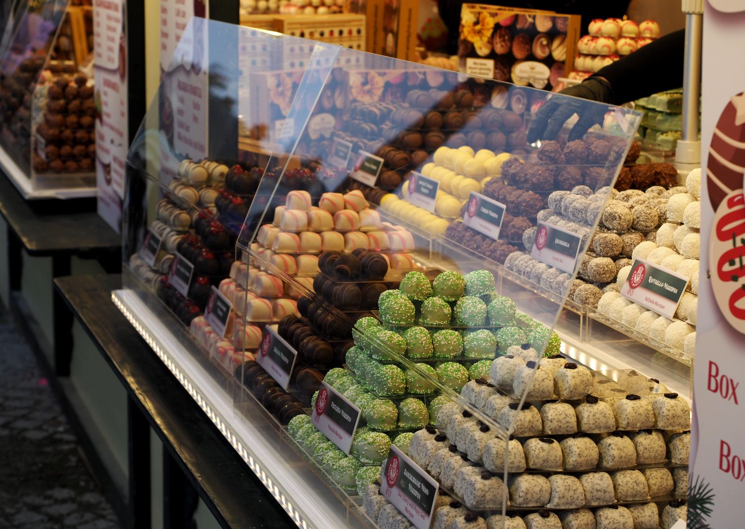 Food choices are numerous. Gingerbread of course, chocolates, hot dogs and chestnuts or Maroni, in German, are always popular. Plastic products are generally rare, wood, straw, glass, metal, clay, and fabric with enough food and drink to satisfy the thousands of visitors that come to the city each festive season from all over Europe and further. A cluster of wooden cabins sell a wide range of gift items, including, sculpted candles, handcrafted decorations, wooden nativity scenes, jewellery, tableware and gourmet items and cheeses.