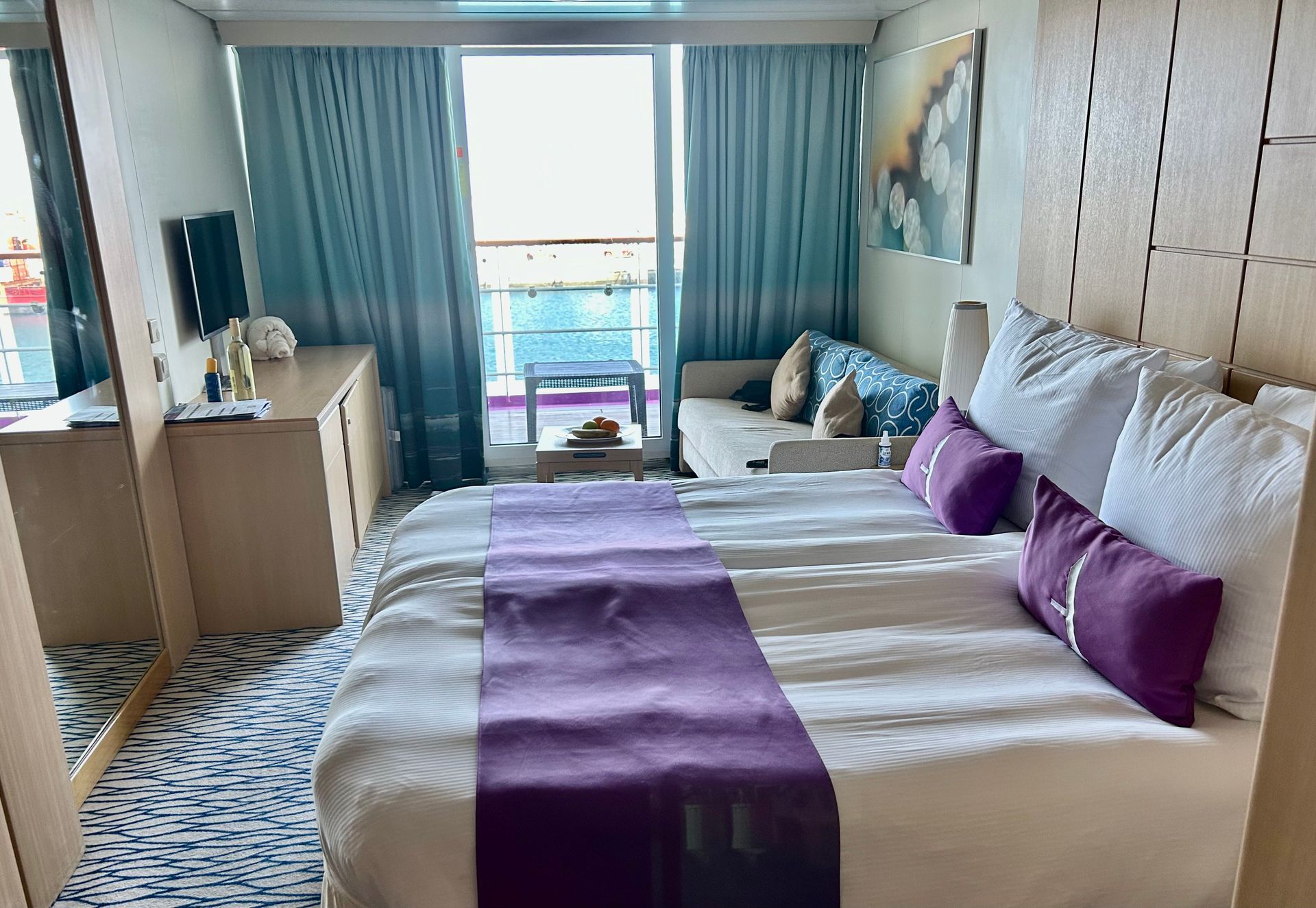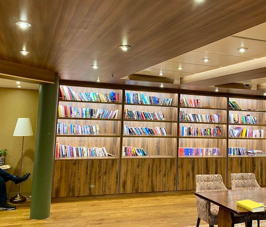 My cabin is on deck 10, spacious with large double bed, dressing unit, 3 seater settee, a bathroom with both shower and bath and accessories of tooth brush and paste, shower caps, combs, ear buds etc. Drawer, shelf and hanging space was more than enough, even for an extended voyage. Hairdryer, safe, fridge and tv come as standard plus two UK electric sockets, a 2 pin European and two USB slots.