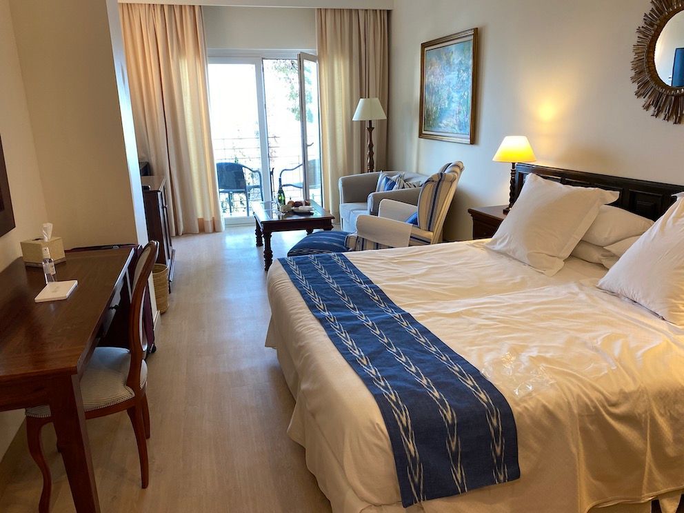 Waking to a clear blue sky the sun is already sending shimmers across the sea as you sit on the balcony with your first coffee or tea of the day. Breakfast is taken in the separate ‘Breakfast Room’, white chairs and tables make it bright and airy, overlooking one of the three swimming pools. The selection is vast. Fresh fruit, cheeses, jams, honey, meats, sausages, beans, bacon, mushrooms the list is endless. Fresh orange juice? certainly, there is an orange squeezer to give you the freshest orange juice ever. The egg station where a chef will cook them to your order, omelet? select your own fillings, try one with just peppers to give a slight ‘crunch’, I loved it.