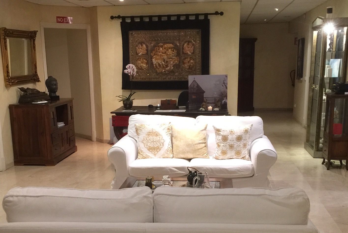 Take the lift down 2 levels, exit along a marble corridor passing the small but beautiful chapel, a marble altar supported on 4 matching pillars, the white cloth covered top adorned with Crucifix, Bible and twin candles looked over by a statue of the Madonna standing in prayer, two seats for those re-taking vows or having rings blessed. It exudes an air of peace and tranquillity.