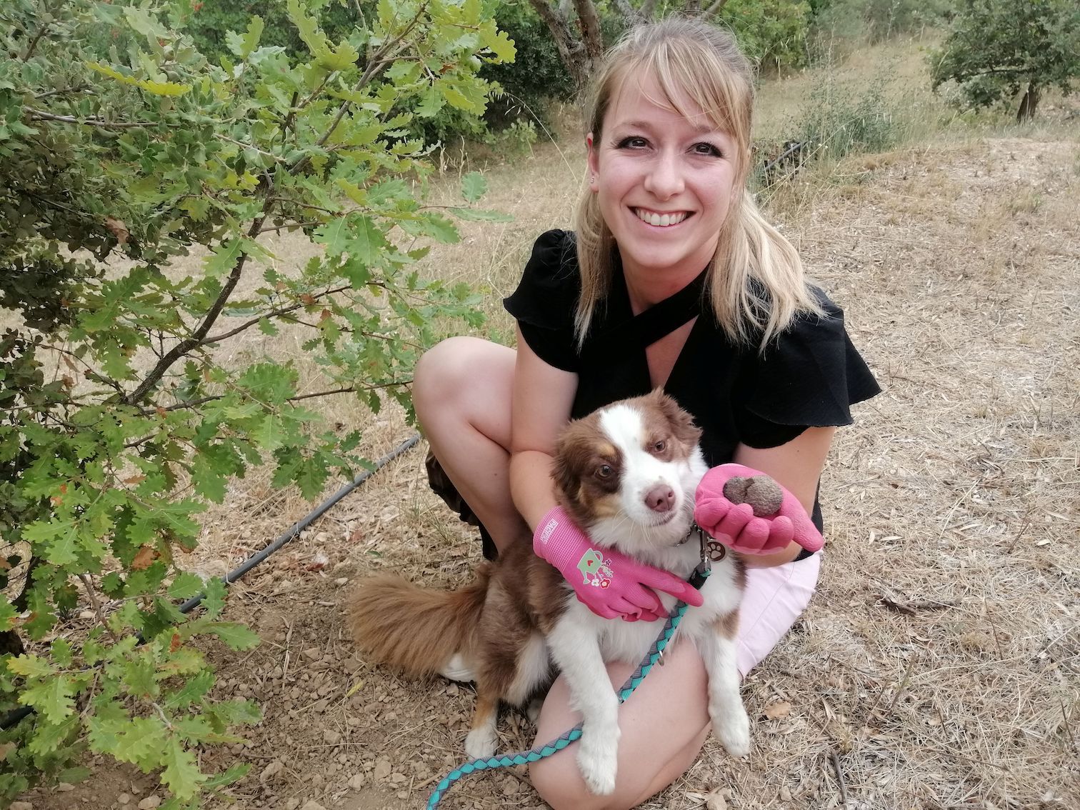 A miniature, fluffy, brown and white, 18 month-old, miniature American Shepherd, Bill earns his keep by searching for the delicate, treasured fungi.