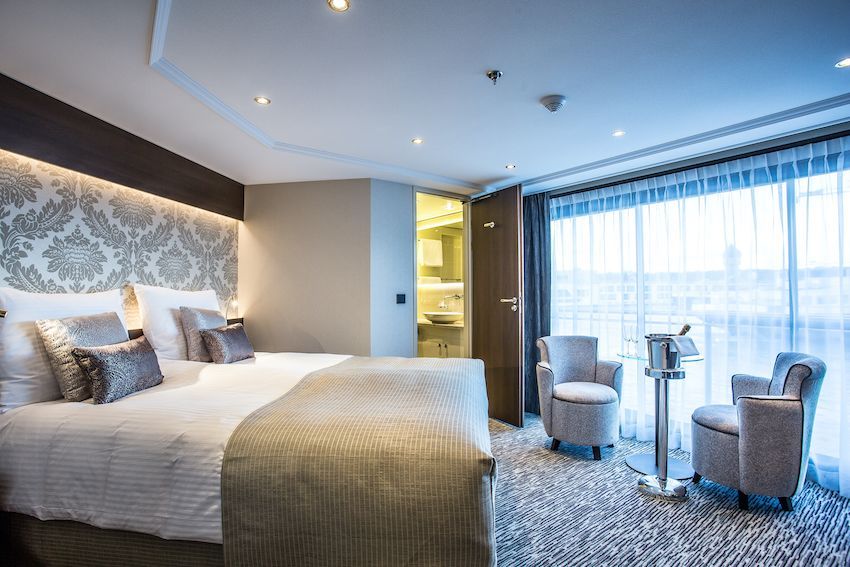 My roomy, upper deck cabin boasts a seating area with two chairs and table in front of a sliding glazed patio door, which enables stunning views of the ever-changing vista. a double bed cleverly-angled to get the most of the views, a rain shower bathroom, flat screen tv plus tea and coffee-making facilities.