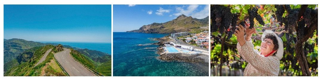 Images (left to right): Miradouro da Lomba do Mouro ©Nuno Andrade, Lido Bathing Complex ©Filipe Mendonca; and Madeira Wine Festival ©Francisco Correia