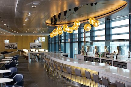 There are luxury wellness Therabody Suites and showers for customers to relax prior to their flight, as well as rows upon rows of comfortable seating on two levels, and a huge bar and a dining area.